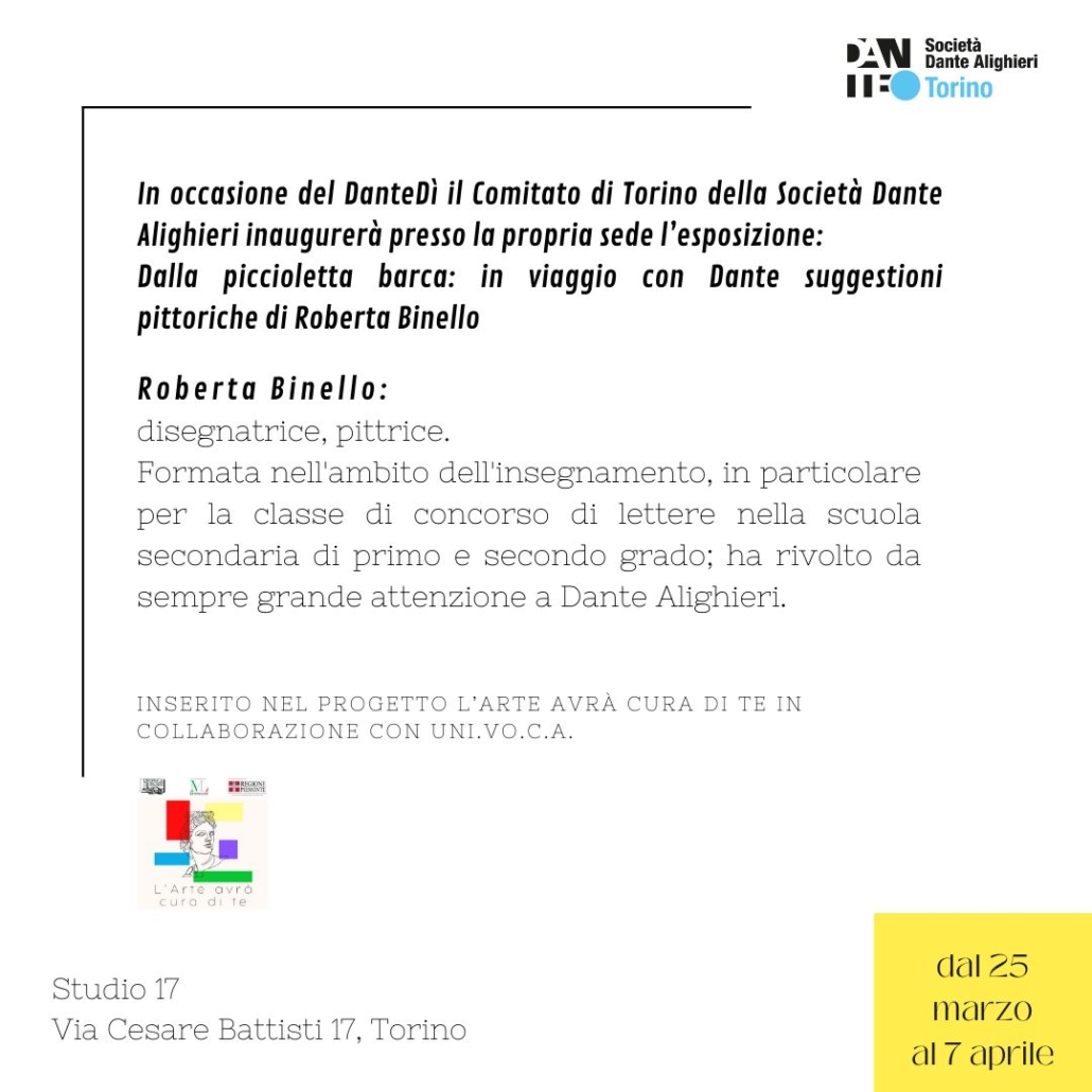 Lunedì 25 marzo, alle ore 18.00 in occasione del DanteDì il Comitato di Torino della Società Dante Alighieri inaugurerà presso la propria sede in via Cesare Battisti 17 l’esposizione Dalla piccioletta barca: in viaggio con Dante suggestioni pittoriche di Roberta Binello.