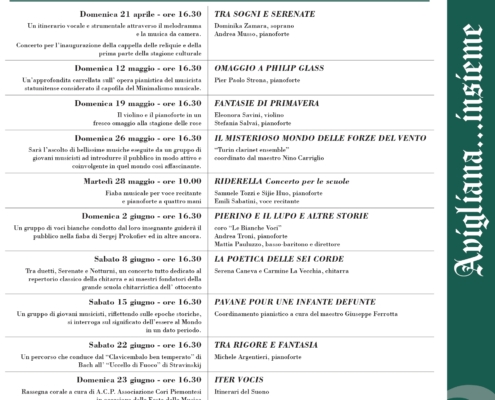 Esperienze di suono vivo declinate in undici progetti di ascolto partecipato e attivo. Chiesa di S. Maria Maggiore - Borgo Vecchio in Avigliana 21 APRILE – 30 GIUGNO 2024 Scarica il programma in PDF   PROGRAMMA …