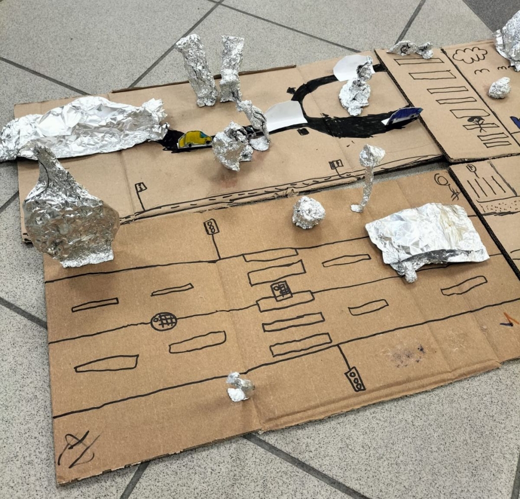 Si disegnano sulla base di cartone strade, rotonde, isolati, parchi che saranno gli spazi della città.