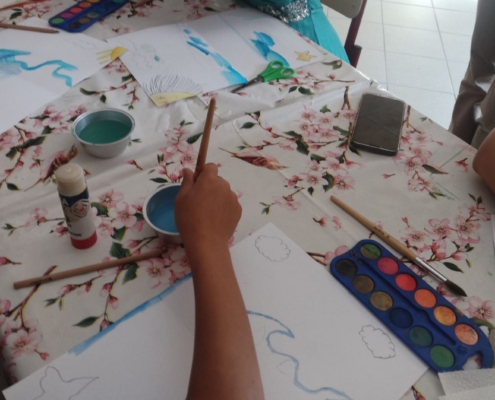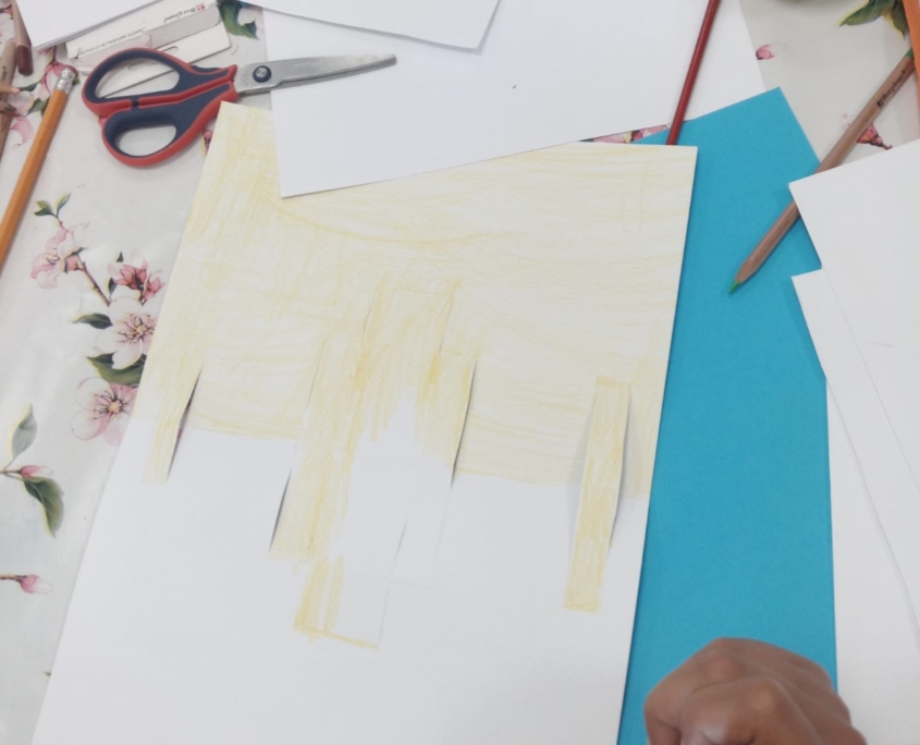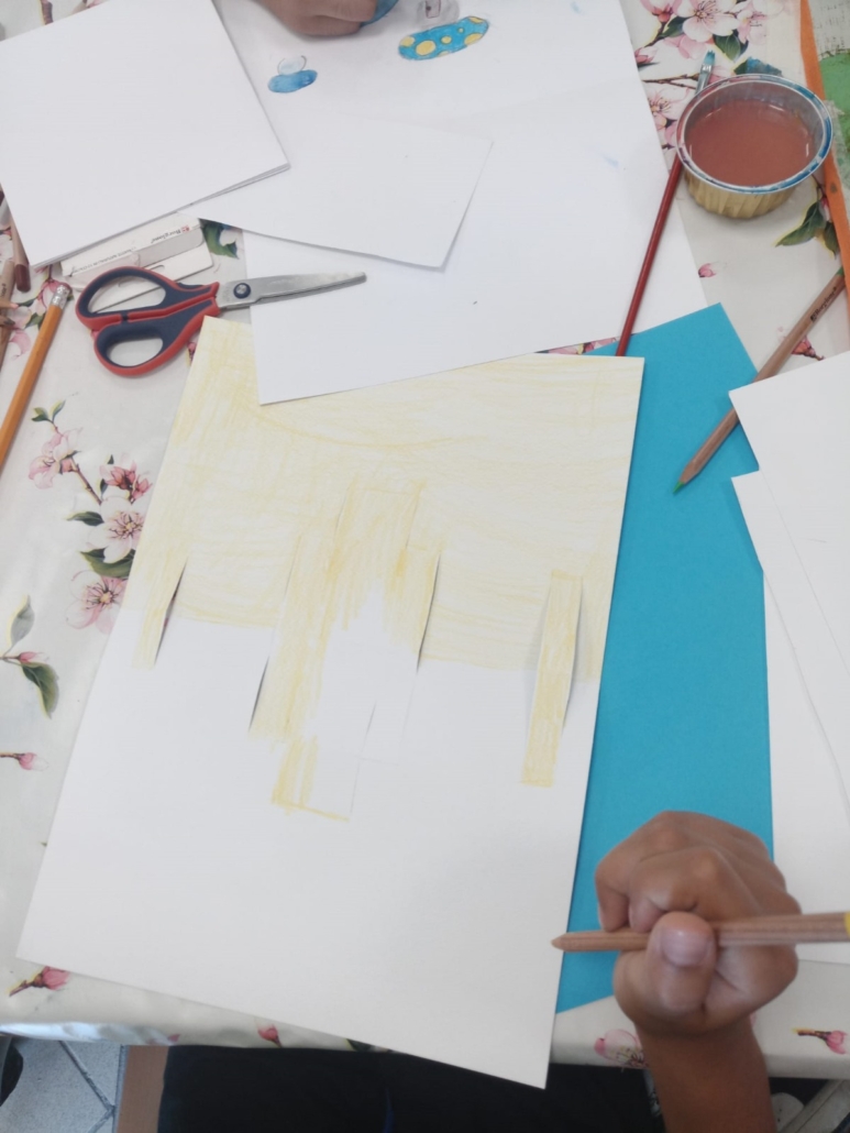 Aprire il cartoncino e disegnare nell’interno il fondale in cui inserire il proprio personaggio, dipingendo poi con gli acquerelli.
