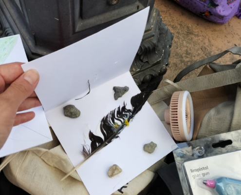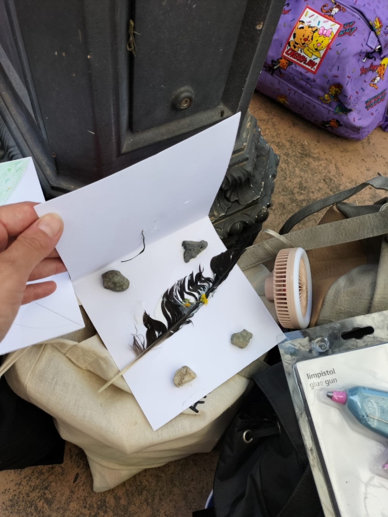 Passeggiata sensoriale all’interno del parco; concentrandosi su quello che tutti i sensi percepiscono: non solo forme e colori, ma anche odori, suoni e versi; sensazioni tattili e, quando possibile, sapori. È stato chiesto nel frattempo ai partecipanti di raccogliere 4 piccoli elementi naturali da utilizzare nel secondo momento dell’incontro. Al termine della passeggiata è stato realizzato un semplice libricino polimaterico per memorizzare e conservare l’esperienza; una sorta di diario di viaggio sensoriale.
